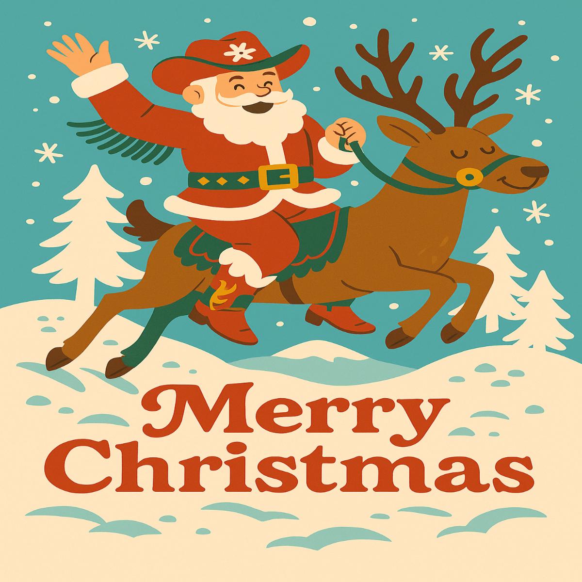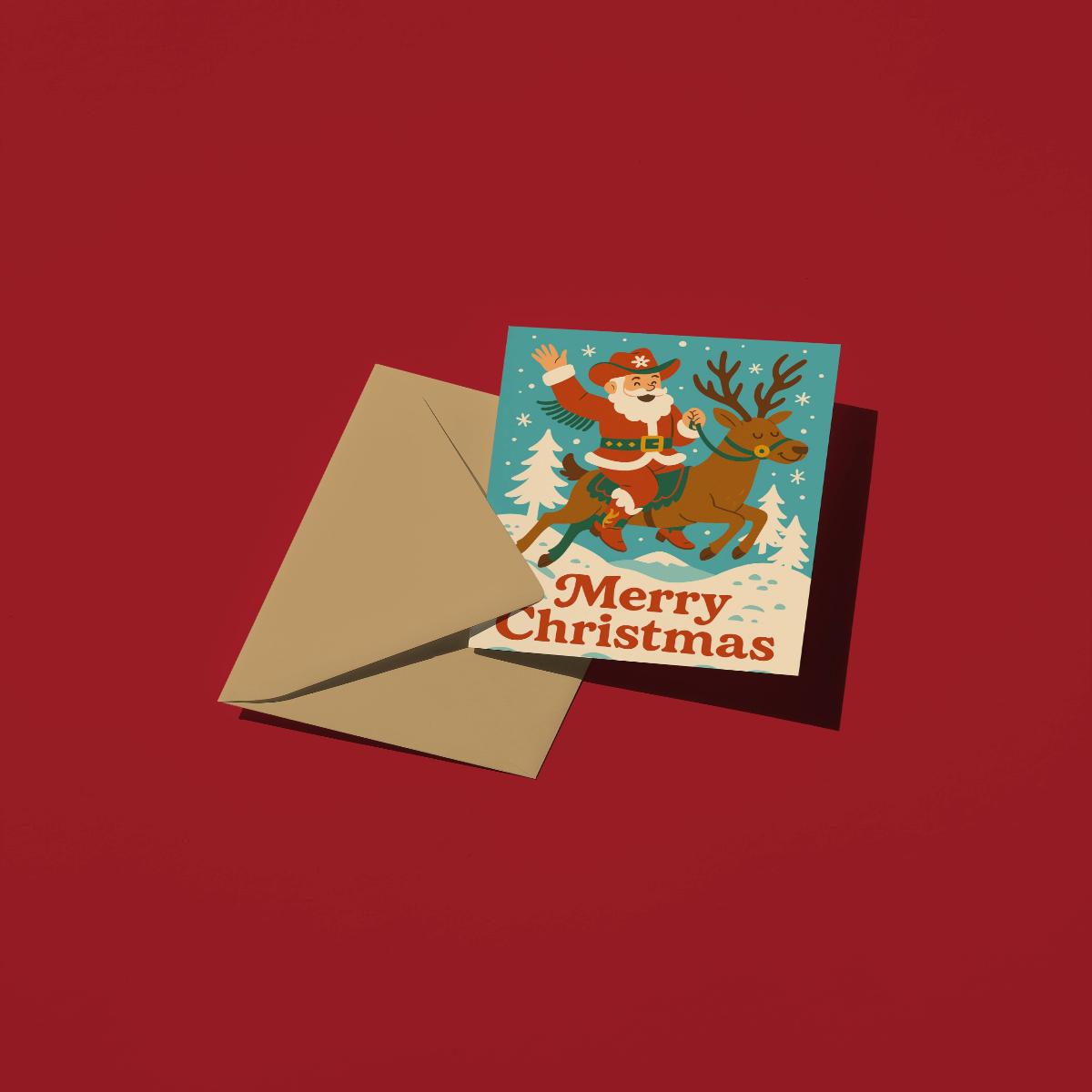 Santa’s traded in his sleigh for a reindeer rodeo! This festive card brings a western twist to Christmas cheer—perfect for anyone who likes their holidays with a little extra giddy-up.